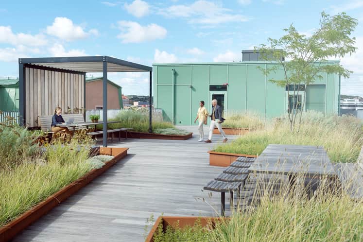 Vi har gjort det enkelt at træffe et mere ansvarligt valg. Ved at genbruge byggematerialer fra tidligere indretninger, såsom glasvægge, lofter, belysning og tæpper kan vores lejere i samspil med os skabe moderne og funktionelle arbejdspladser med lavere klimaaftryk.